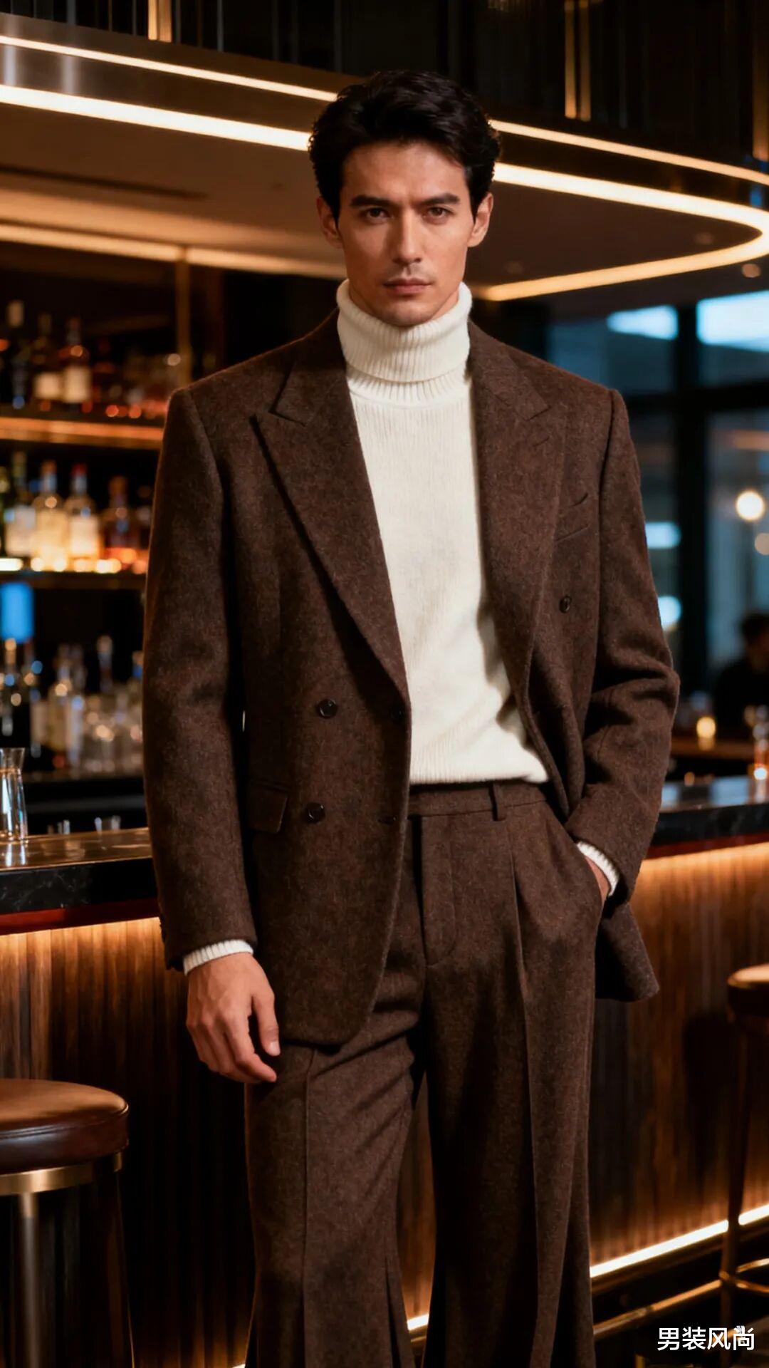 • 高领羊绒衫:秋冬必备单品,100%羊绒面料柔软亲肤,保暖性强,且自带垂坠感,上身显高级。颜色选择燕麦白、浅灰色、深棕色,与西装搭配和谐。适合气温较低的场合,单穿内搭+西装即可,无需额外加外套,利落又体面。