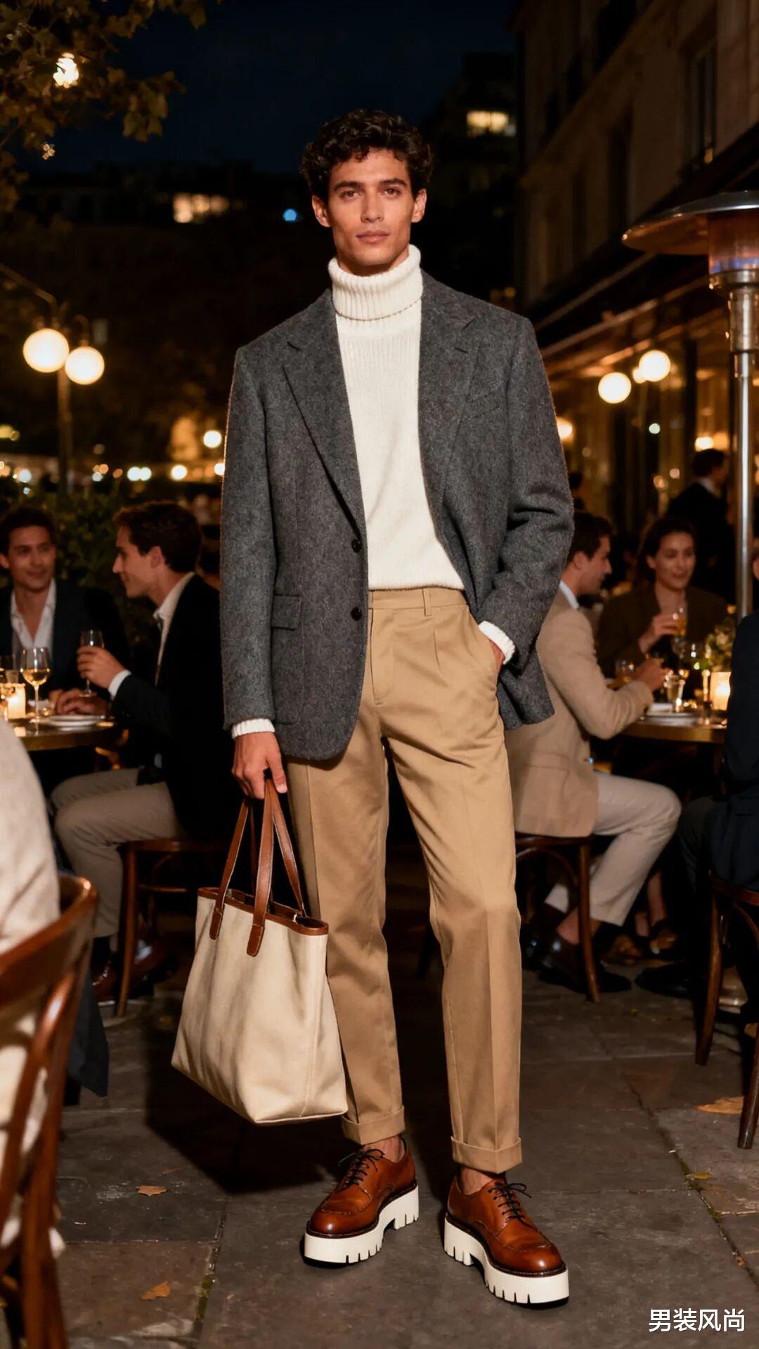 搭配公式:藏青微廓形羊毛西装+浅灰色高领羊绒衫+烟管裤+深棕色乐福鞋+棕色皮质皮带+简约公文包这套搭配比正式场合多了一丝松弛感,高领羊绒衫替代衬衫,保暖又舒适,藏青与浅灰色的组合沉稳又不失温柔,适合商务宴请、客户对接等半正式场合。乐福鞋的加入增加了休闲感,让交流氛围更轻松,公文包则方便携带文件或个人物品,实用又美观。场景三:晚间小聚/城市漫步(休闲场合)