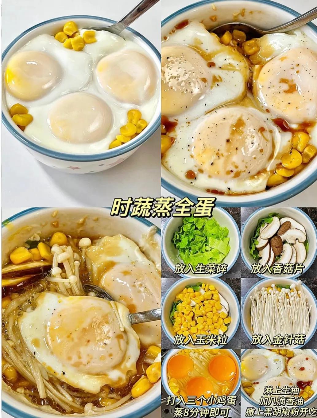 1️⃣ 蔬菜铺碗底,鸡蛋打散加半碗温水搅匀