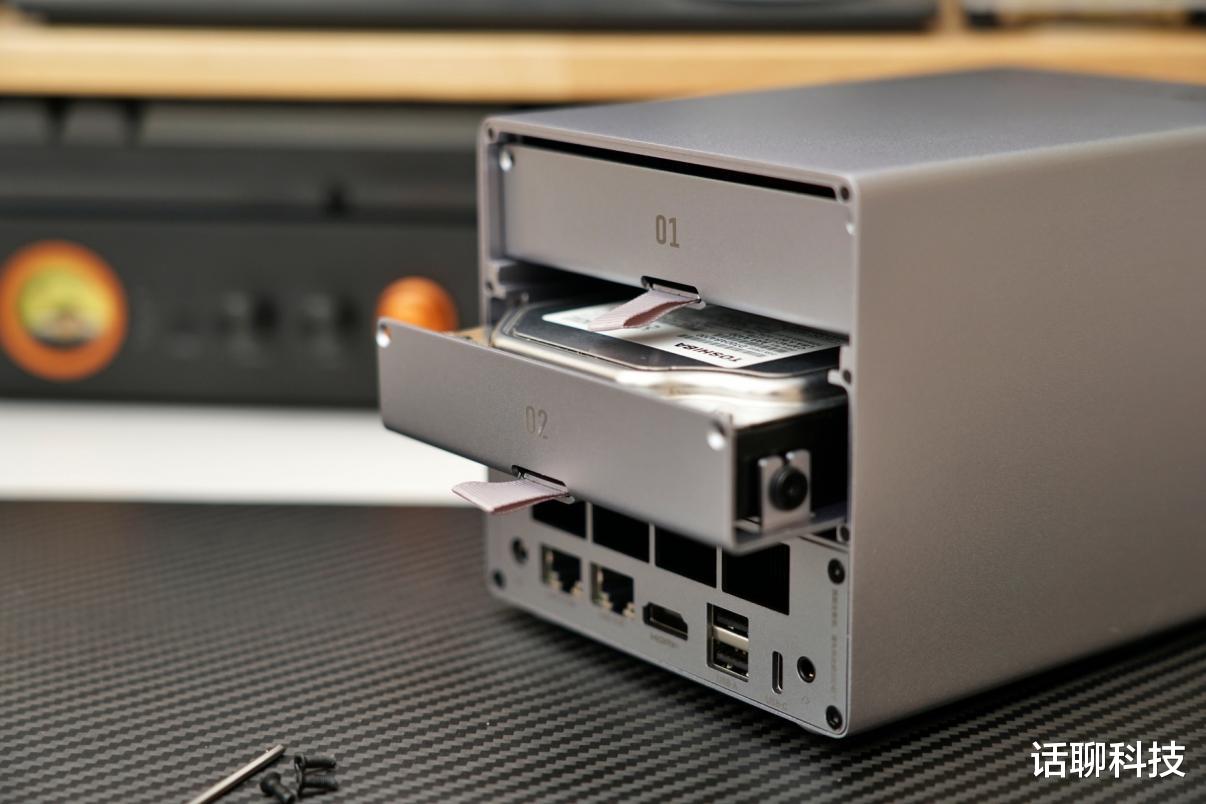 去掉网罩,就露出了两个3.5英寸硬盘位,其采用了类似床头柜的双抽屉式设计,并用内六角螺丝直接固定。这样一来尽管是换盘可能略显麻烦,但比起传统NAS的快开锁结构,大大节省了空间,而且硬盘安装之后的连接稳定性也更好。
