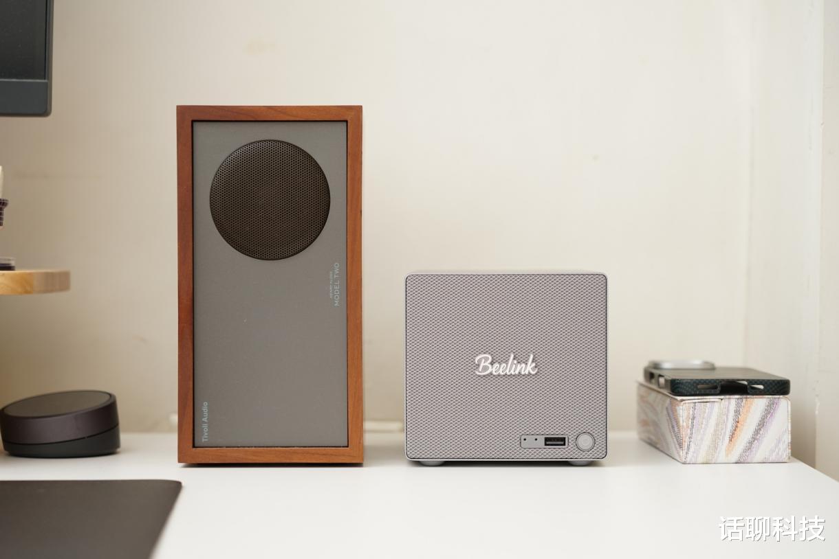 166mm×121mm×112mm的外观尺寸,2.25L的紧凑体积,也就相当于3块3.5英寸机械硬盘叠放的尺寸,并且整机重量仅1.55kg,比同盘位NAS减重近40%,而做工完全是按照零刻做GT系列旗舰迷你主机思路来的,一体成型金属外壳,细腻喷砂工艺的金属质感,方正中带着几分圆润,正面灰色透气网布覆盖,中间有Beelink标志,右下角是一个USBA接口和电源按键,看上去还以为是复古音响之类的。下图是与我桌面上复古小音箱摆在一起的样子!!!