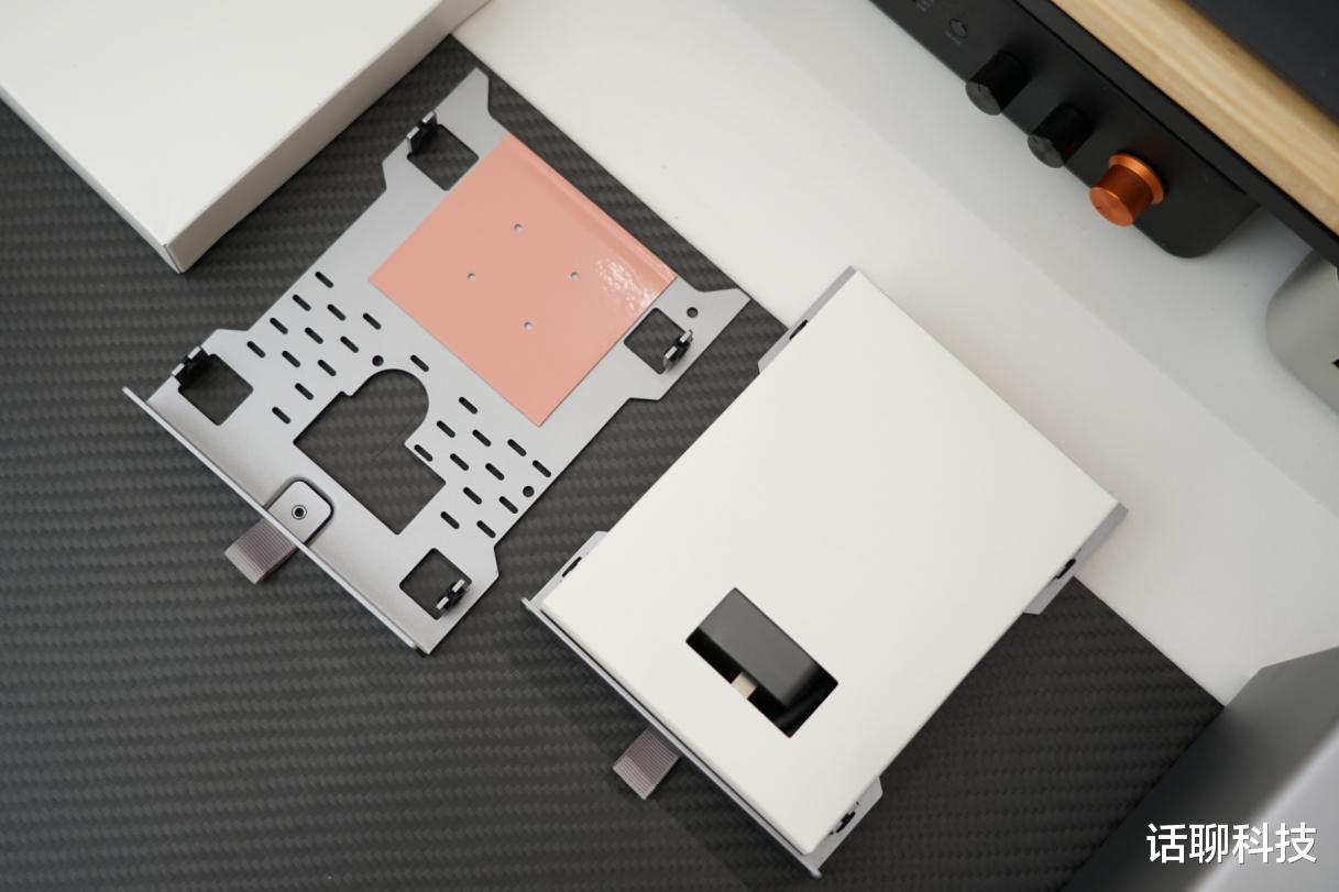 而从机械硬盘插槽的设计以及支架来看,零刻Me Pro也是超越了传统NAS的思路,传统NAS大部分是塑料支架,而Me Pro是金属支架。这个支架有多硬核呢,电源配件的白纸盒都是直接粘贴固定在硬盘支架上运输的,厂家压根就没担心路途遥远,支架变形或者是纸盒松动碰伤电路板之类的问题。