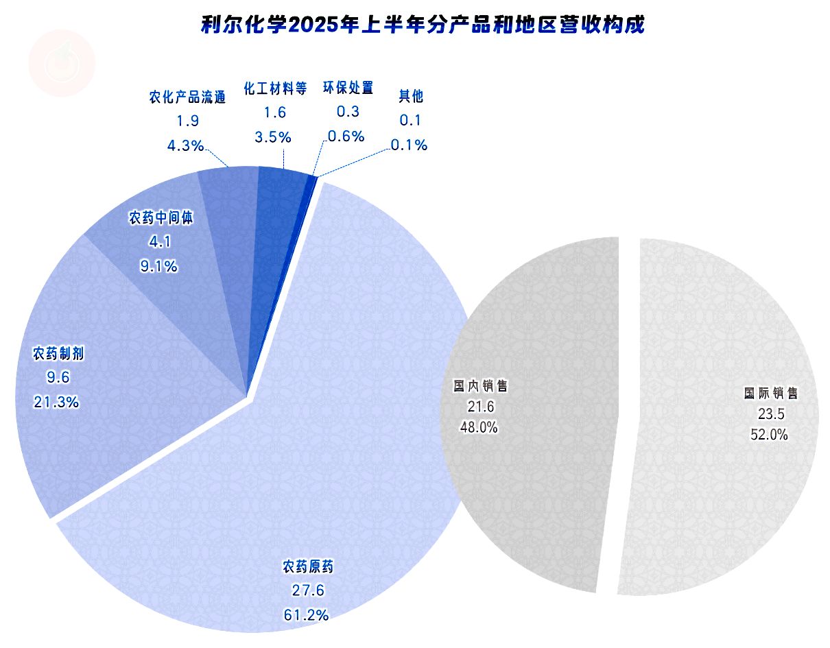 利尔化学主要从事高效、安全类农药的研发、生产和销售,产品包括除草剂、杀虫剂、杀菌剂三大系列共30余个原药、100余个制剂品种以及部分化工中间体。产品出口美国、巴西、阿根廷和澳大利亚等三十多个国家和地区,与巴斯夫、科迪华等多家行业内国际顶尖农化企业建立了长期稳定的战略合作关系。