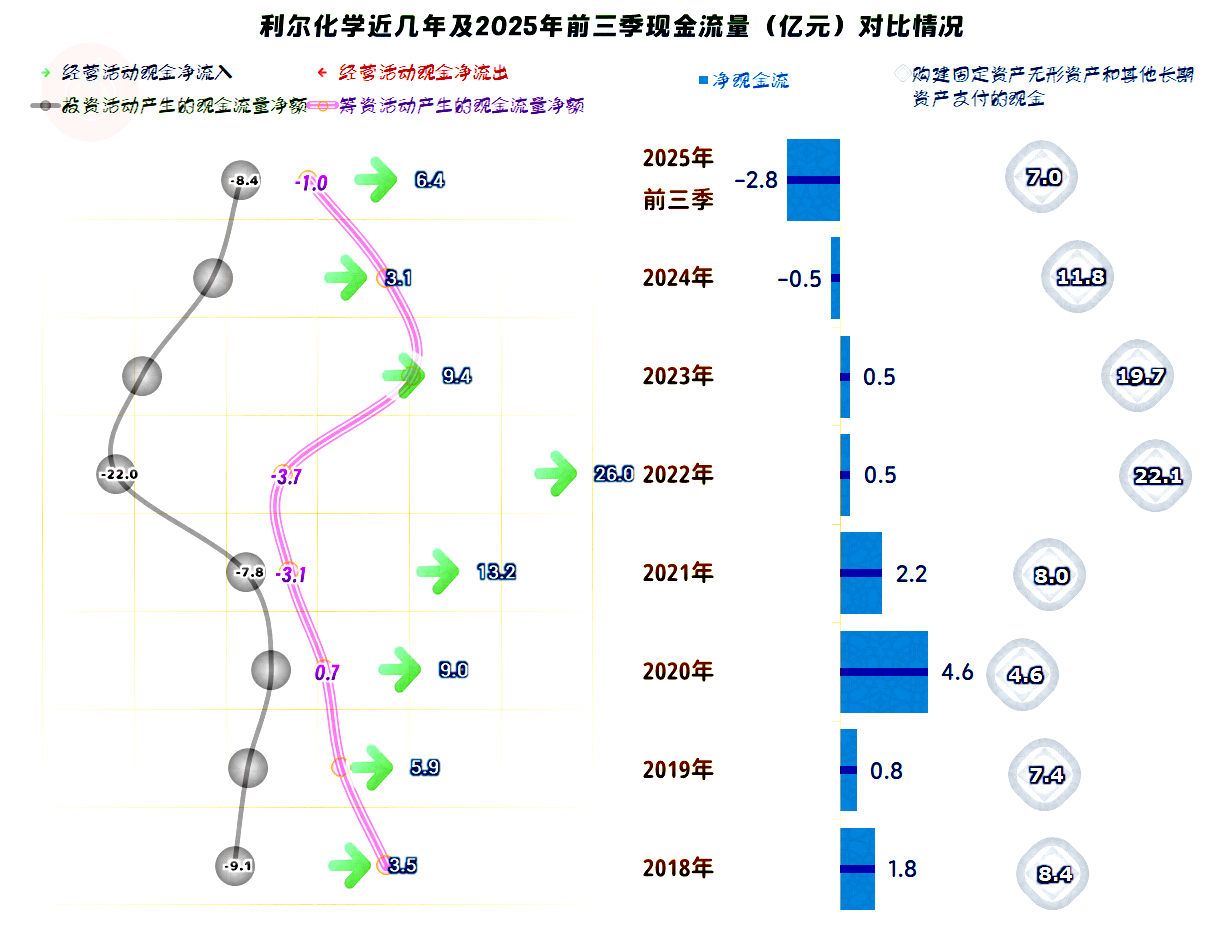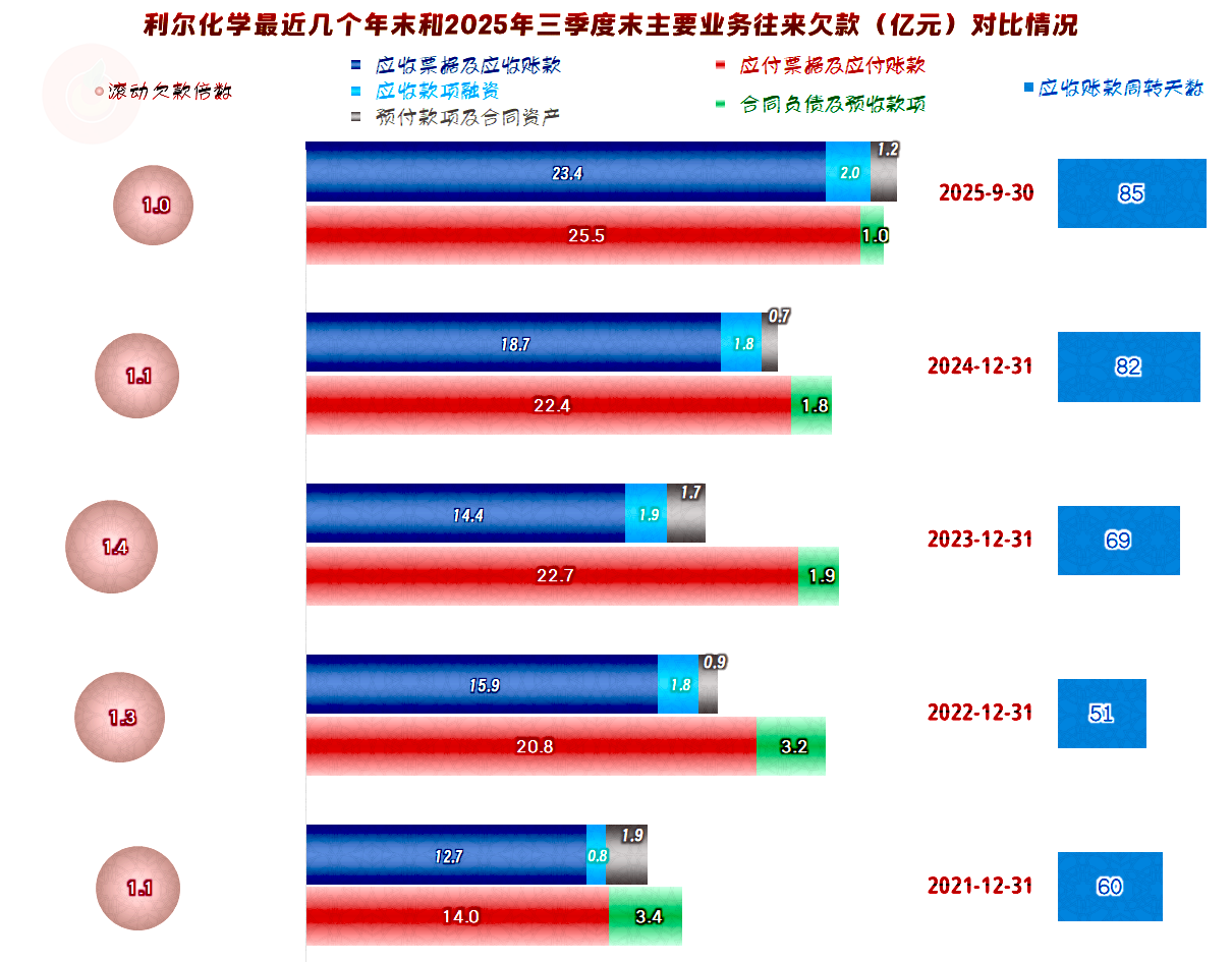 利尔化学的应收类业务款项增长幅度是比较大的,从2021年末以来,有接近翻倍的增长;应付类的业务款项前两个年末都无法增长,2025年的营收增长后,也恢复了增长状态。但最终的结果是,首次出现应收类业务款项超过应付类业务款项的情况,通过供应链来免费融资的时代似乎正在成为过去。