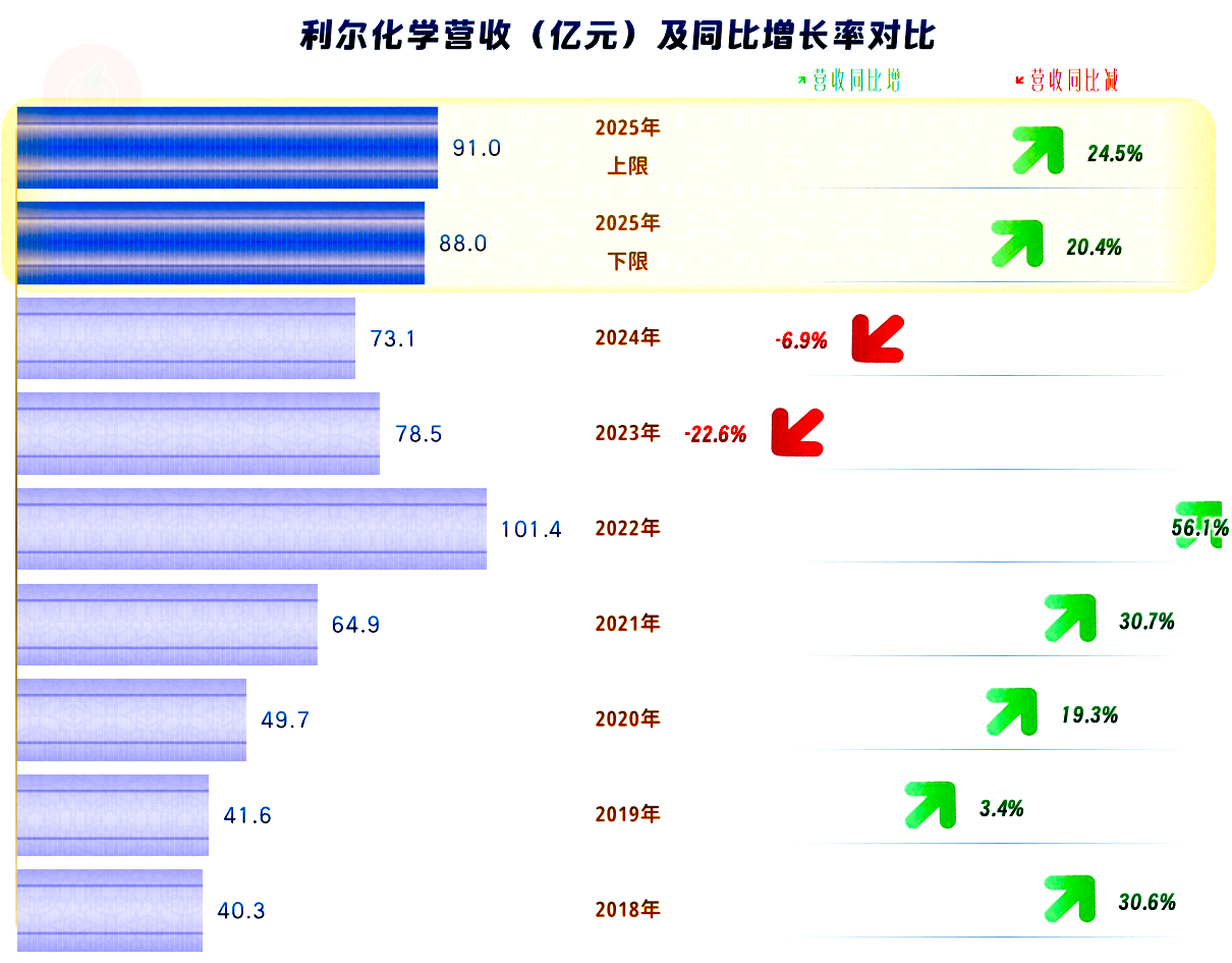 2025年,利尔化学的营收在88-91亿元之间,增长超两成,规模上仅次于2022年这个化工行业的大繁荣时期。2023年和2024年的连续下跌,仅靠一年时间还补不回来。