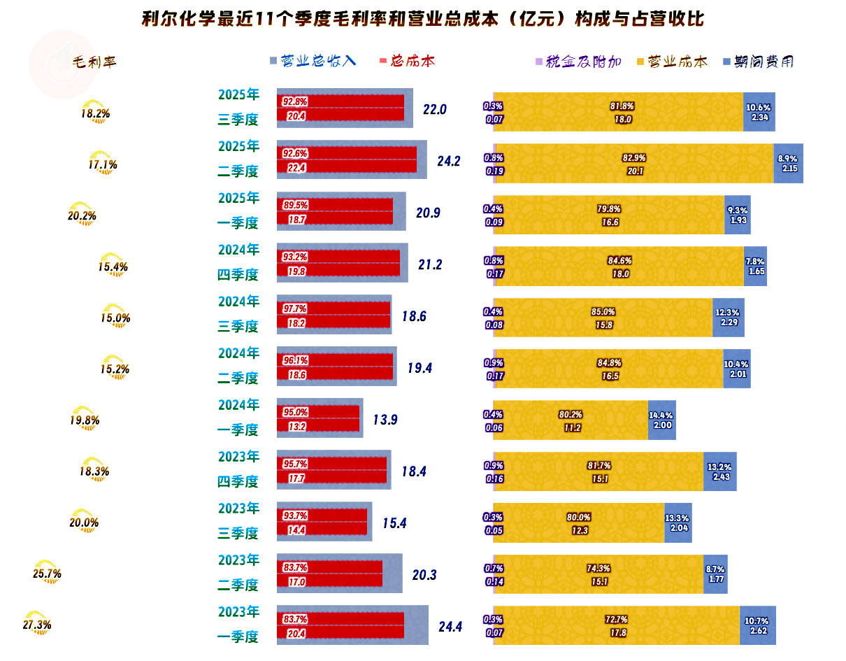 除2024年是及格水平之外,利尔化学的销售净利率和净资产收益率都是优秀级的水平。但优秀也是有区别的,2025年前三季度的两大指标都是仅高于2024年的水平,导致这一现象的主要影响因素仍然是毛利率处于相对的低位。