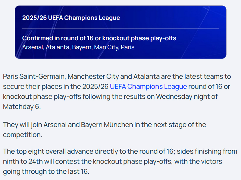 欧足联官网确认,5支球队已经锁定附加赛资格(前24名),包括榜首18分的阿森纳,15分的拜仁慕尼黑,以及巴黎圣日耳曼、曼城和亚特兰大,三支同积15分的球队。其中英超2队,德甲、法甲和意甲各1队,五大联赛独缺西甲。