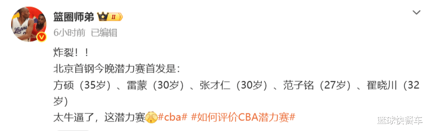 CBA新赛季才刚开打两天,CBA联赛便曝出了最荒唐一幕。作为CBA新赛季增设,为了培养新人的潜力赛,竟然直接沦为老年赛了。在北京队以84-74击败江苏队以后,随后的潜力赛,北京队派出了死亡五老,翟晓川、方硕、范子铭、张才仁以及雷蒙领衔出战,要知道,这5人可是北京队的老将,他们的平均年龄已经达到30.8岁。不知道CBA这潜力赛,究竟是培养新人呢,还是锻炼老将?