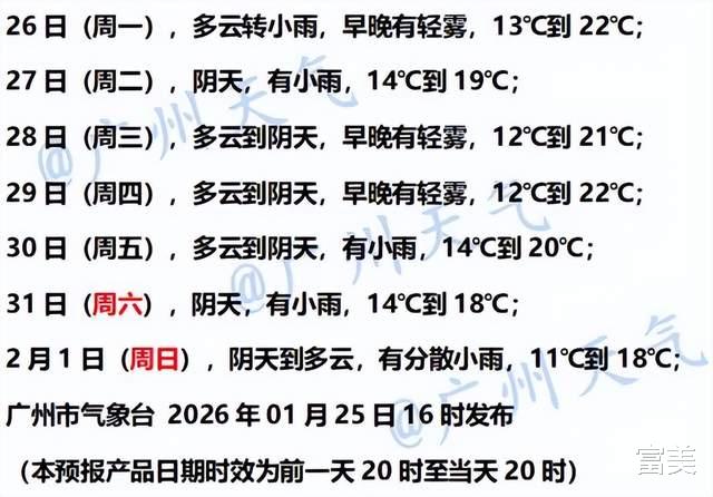 广州具体预报:26日至27日受高空槽和弱冷空气影响,云量增多并伴有小雨,气温小幅下降;28日至29日转为多云到阴天,早晚有轻雾,能见度较低。