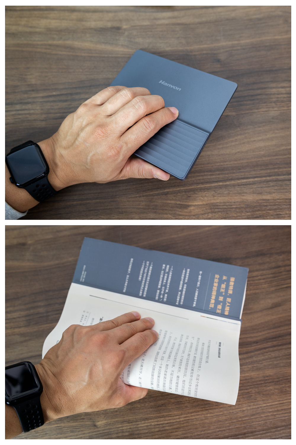 这是完全仿真模拟真实握持书籍手感的人体工学设计,实际效果也非常赞,单手就能牢固且舒适地握持住Clear进行阅读。