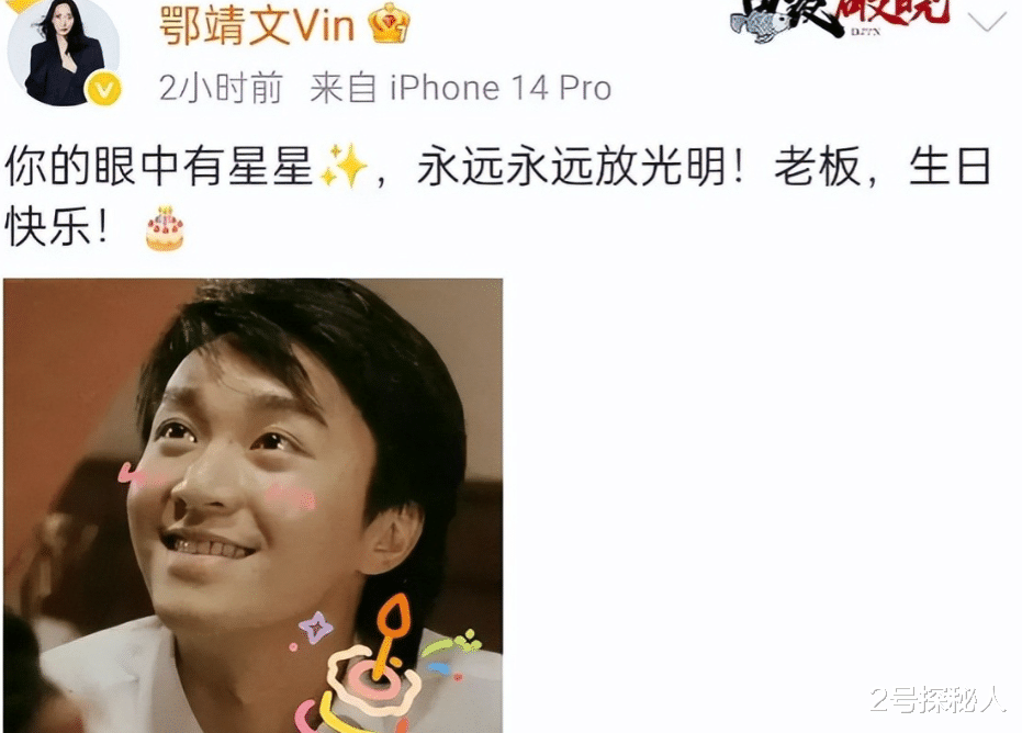 鄂靖文的“老板”称呼,则像职场新人给领导的生日贺卡。她在祝福中写道:“你的眼中有星星,永远永远放光明。”这位30岁才因《新喜剧之王》崭露头角的演员,用“老板”一词既表达了对周星驰伯乐身份的尊重,也暗含一种“打工人”的谦卑。她的祝福虽简短,却精准踩中了周星驰“导演-演员”关系中的权力结构——在星爷的江湖里,合作即恩情,称呼即地位。