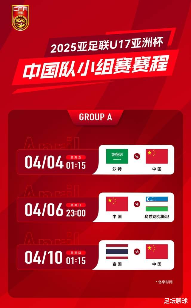 由沙特举办的新一届U17男足亚洲杯,将在今夜23点拉开大幕,日本籍主教练上村健一带领的中国U17男足,迎来首场比赛,对阵东道主沙特,开球时间为北京时间4月4日凌晨1点15分,这也是中国男足各级国字号队伍连续三个月跟沙特男足交手。