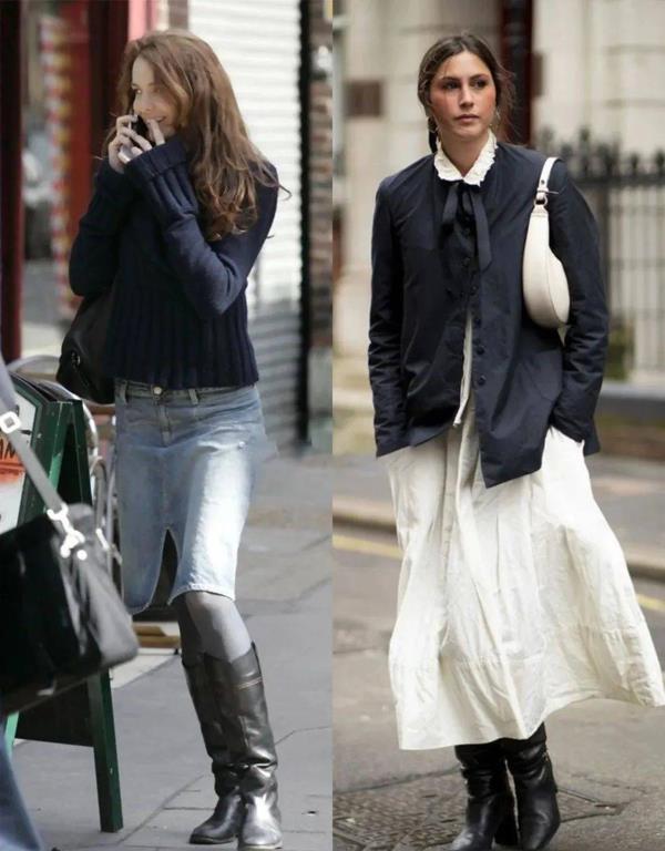 01.及膝长筒靴,配长裙长外套,增加优雅气息