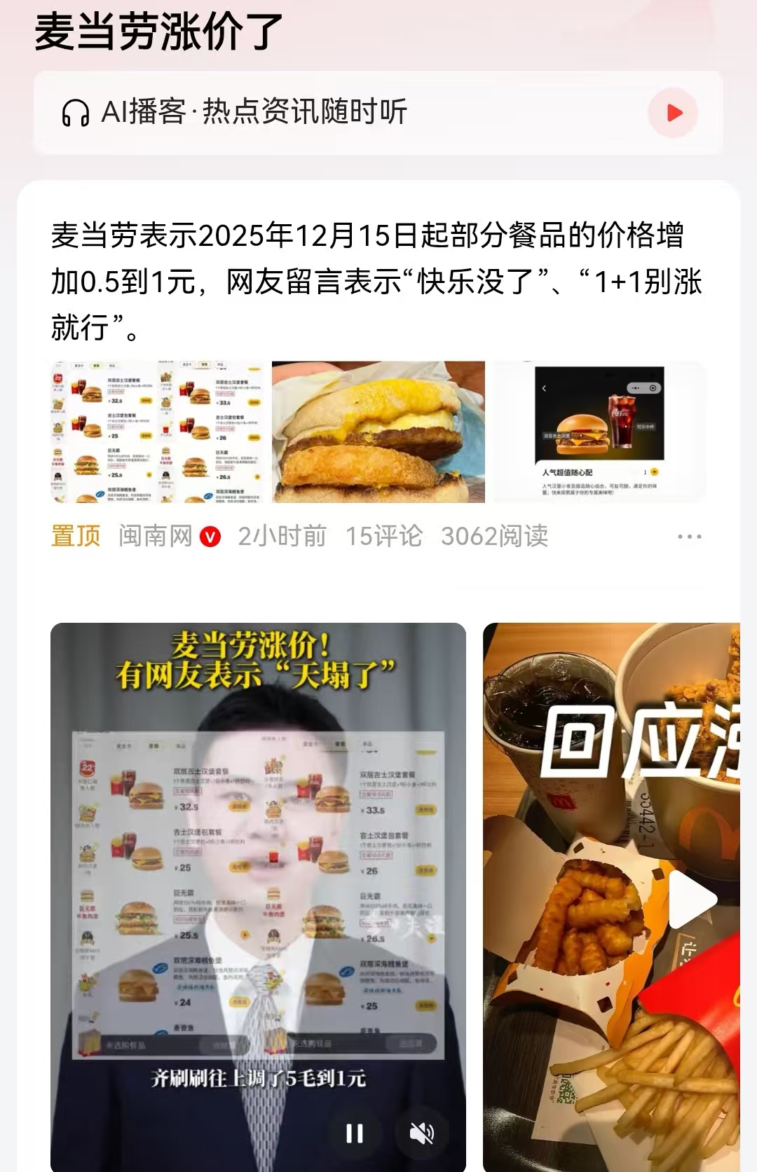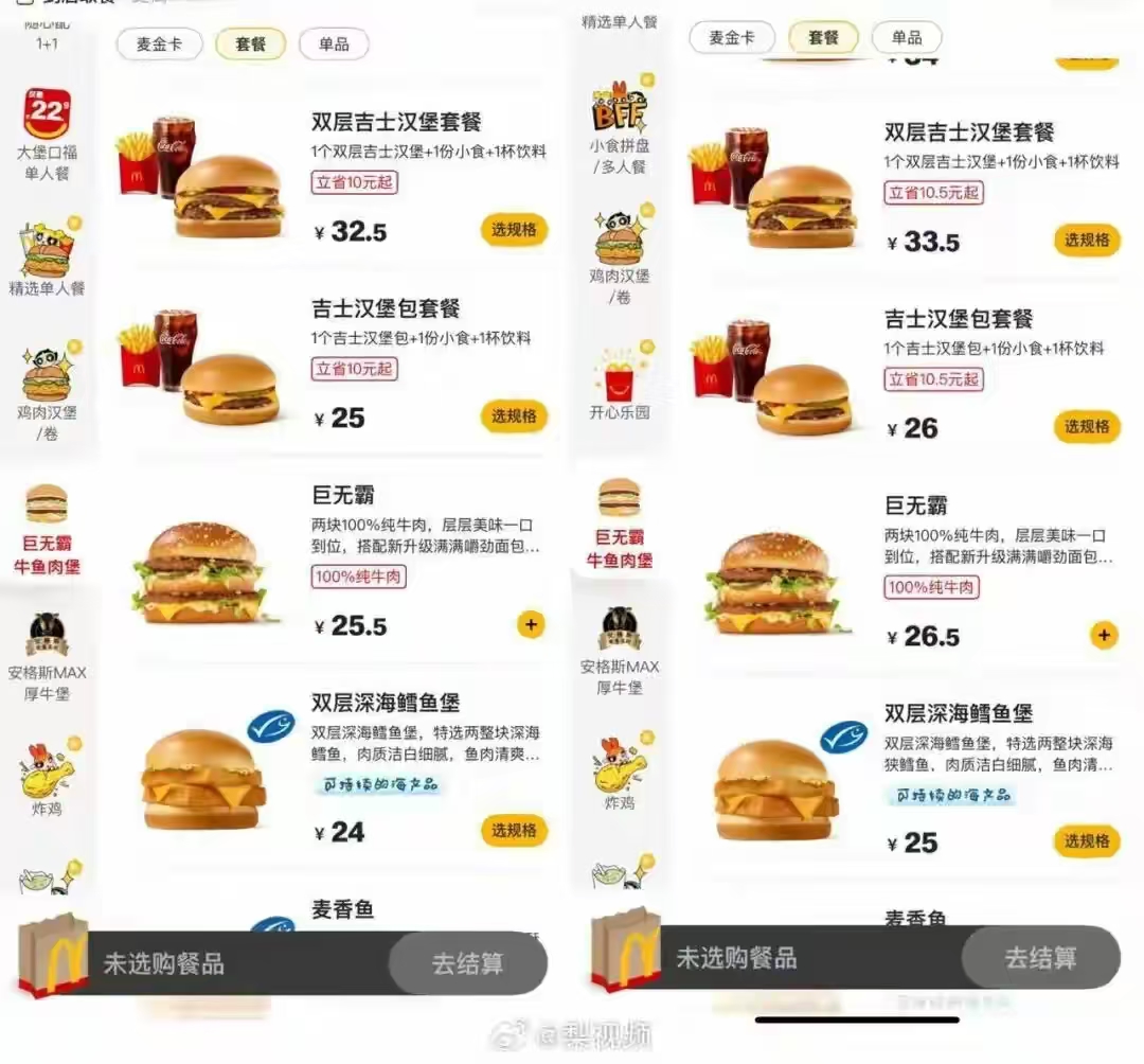 麦当劳各类产品上涨,大约是在0.5元到一元之间,而且涉及涨价的快餐商品还非常多,基本上可以属于全员涨价。不过被网友调侃为“穷鬼套餐”的“1+1随心配”套餐,价格仍然为13.9元,这次没涨价。不过细心的网友也记得,虽然这次没涨,但是上次已经涨过了,因为之前好像只有12元,难道是梯次涨价吗?近两年来中国餐饮市场的内卷化,让消费者深刻感应到去饭店吃东西要比以前便宜了。明显高档的餐厅生意不如以前好了,而麦当劳作为民众消费的平价快餐厅,更应该抓住这一次消费下移的好时光,但是却是逆势上调价格。在目前餐饮选择越来越多的大趋势下,这绝对是一个不明智的做法。