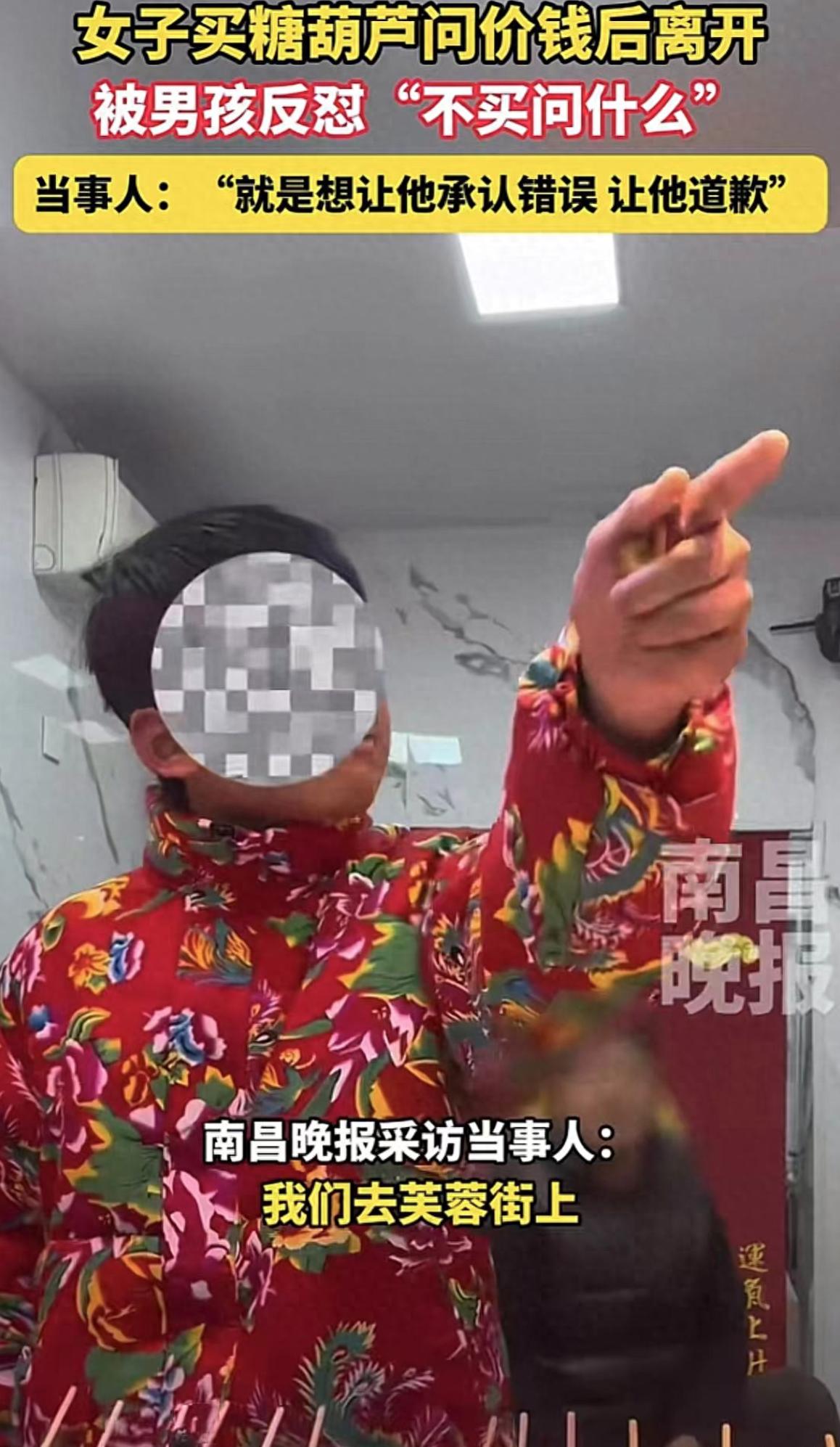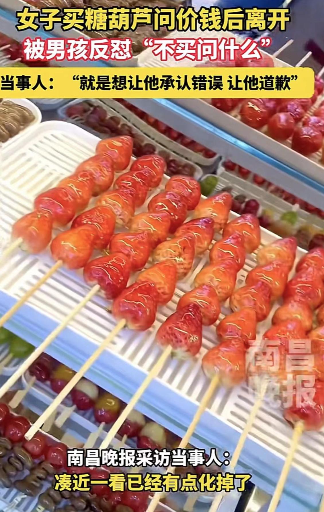 博主的回应:只为道歉,承认错误即可博主随后在网上发布了事件视频,并解释了争执的原因。她表示:“我们只是正常问了糖葫芦的价格,发现糖葫芦有些融化后决定不买,没想到孩子竟然说‘不买你问什么’。我只是想让他道歉,承认自己的错误。结果不仅没有道歉,还继续骂人,实在气不过才发布视频。”