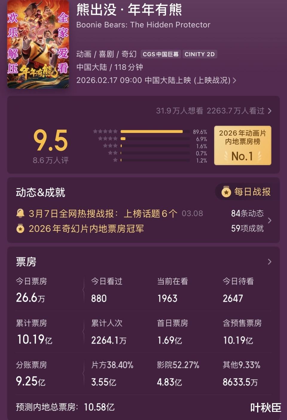 第十二部就是《熊出没・年年有熊》,2026年上映,票房目前为10亿+,豆瓣6.6分。