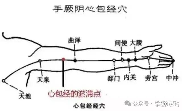 心包经走到这里,位置比较浅,周围的筋肉也多,好像几条小路交汇的地方。平常坐久了不爱活动,或者心里老是记着事情,再或者受了一点凉,这里的气血就容易走得慢,时间长了,气血流动慢一点就容易出现淤堵,慢慢就成了容易有淤堵感的点。