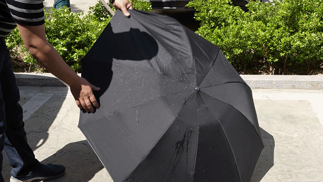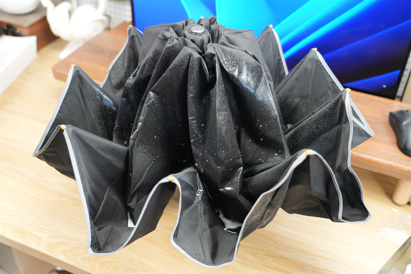 再看看收伞后的表现,轻轻一甩,这把伞就基本干透了,想想普通雨伞,收起来后湿漉漉的,像个“水袋子”,放进包里,不一会儿就把其他东西都弄得湿哒哒的,别提多闹心了。