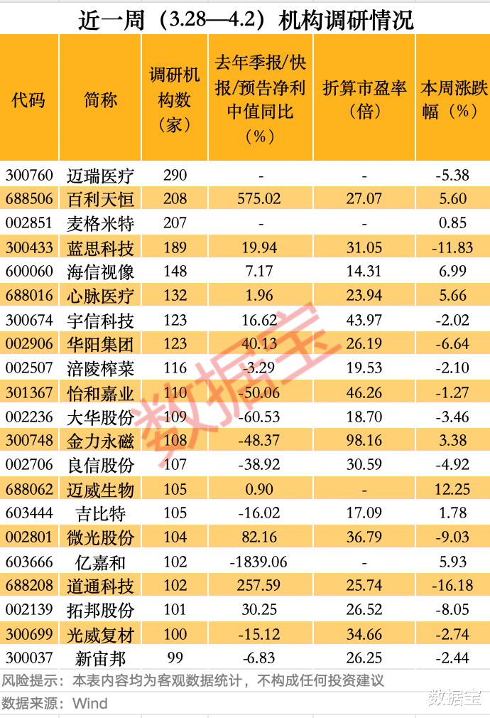 近一周机构调研个股数量有260多只,迈瑞医疗调研机构数最多。