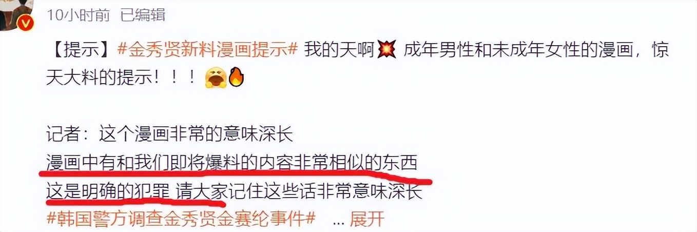 3月24日,横竖研究社的记者已经公开了金秀贤与未成年女性的漫画提示,用“惊天大料”来形容不为过。