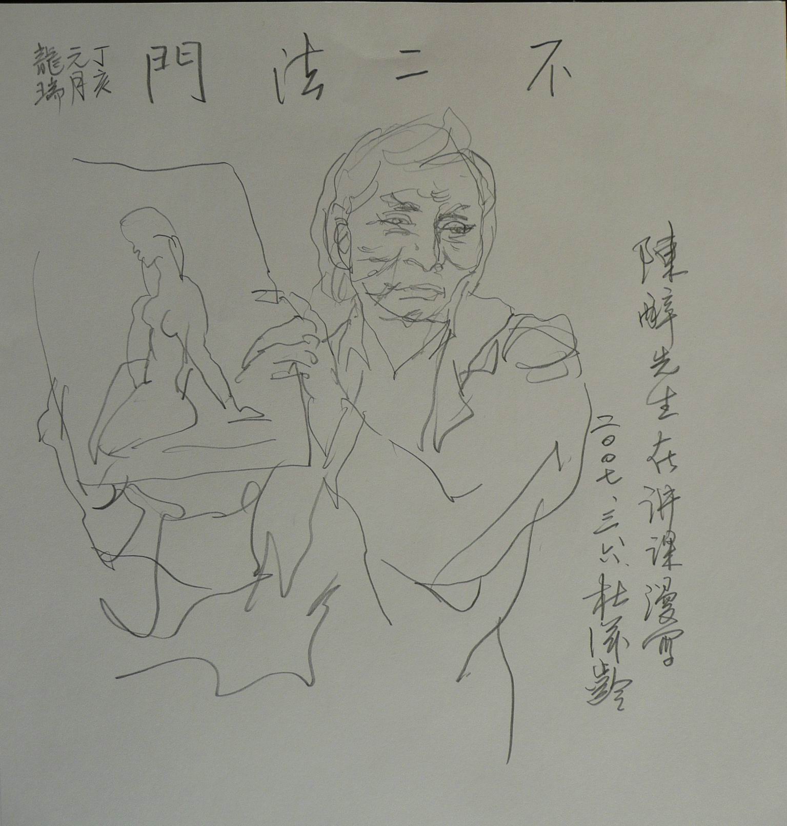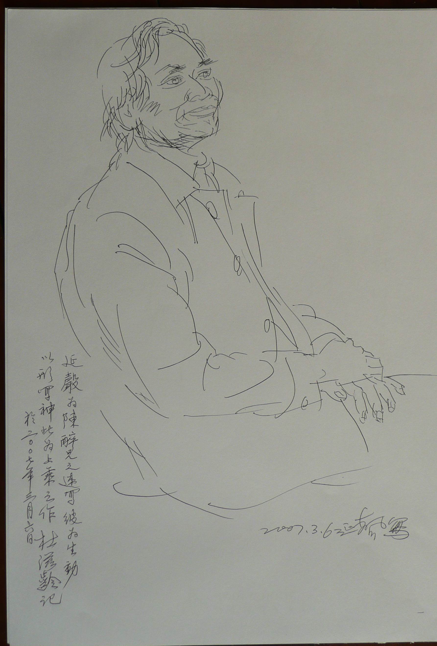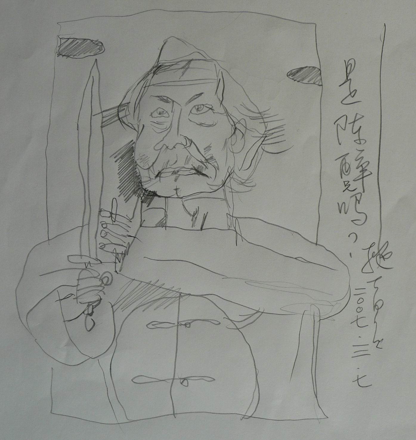 陈醉在文化界有很多朋友,有很多都是各自领域的杰出人物,也就是俗话说的名人。在他的散文随笔集《信步随风》中可以读到不少他与他们交往的趣闻轶事。不过那是文字记载的。今天我们奉献一组形象的材料——陈醉的画像,这些都是朋友们对陈醉的印象、反应。有庄有谐,耐人寻味,但笔底流露出来的都是一片真情!