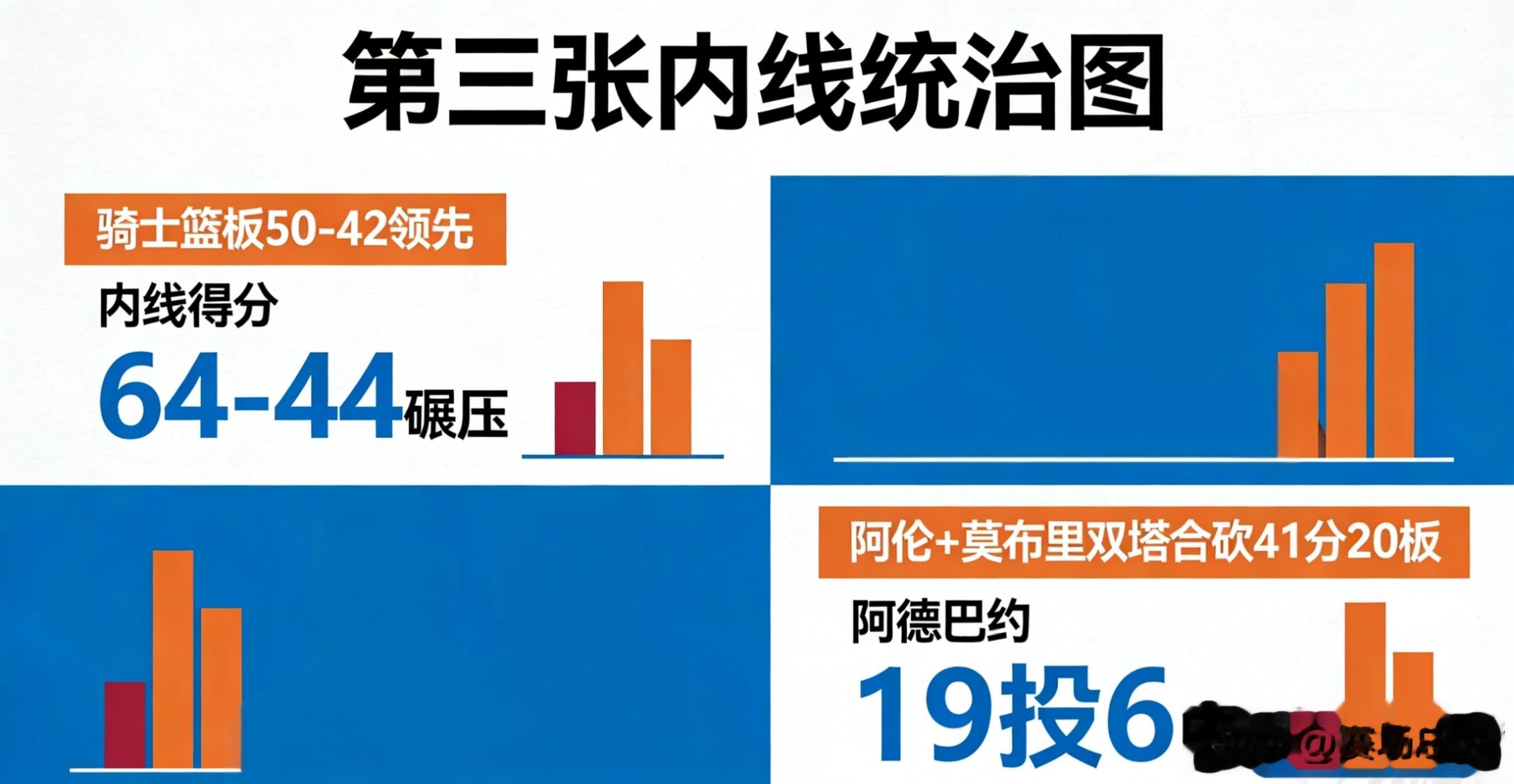 3. 内线统治图:骑士篮板50-42领先,内线得分64-44碾压。阿伦+莫布里双塔合砍41分20板,把阿德巴约限制到19投6中,14分16板的数据毫无含金量 。