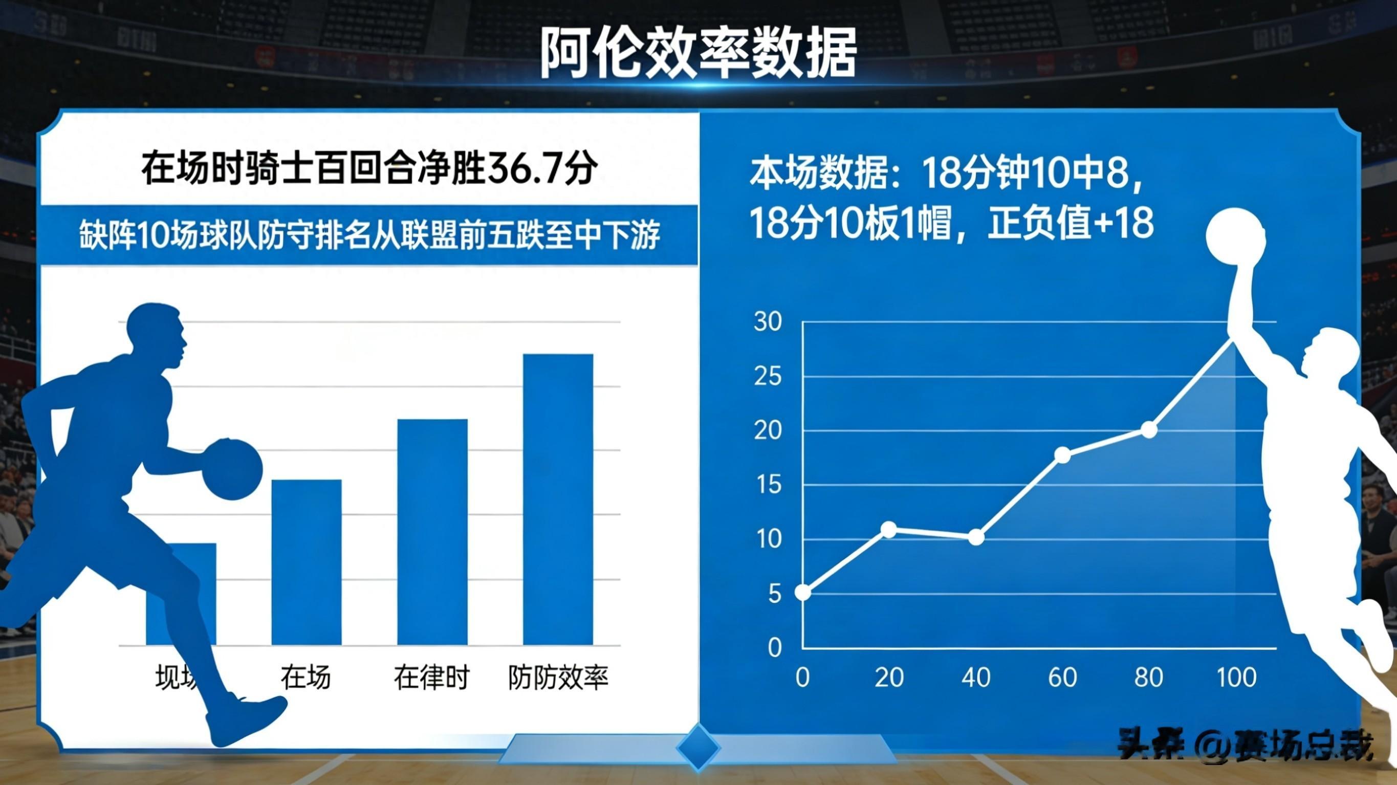 1. 效率分层图:阿伦在场时,骑士百回合净胜36.7分;缺阵的10场,球队防守排名从联盟前五跌至中下游。本场他18分钟10中8,18分10板1帽,正负值+18,每一分钟都在兑现价值。