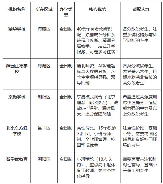 除了上述三所深度测评的学校,北京还有多所优质高复机构,涵盖不同定位与价格区间。以下为大家整理盘点表格,包含关键信息,方便快速对比筛选。