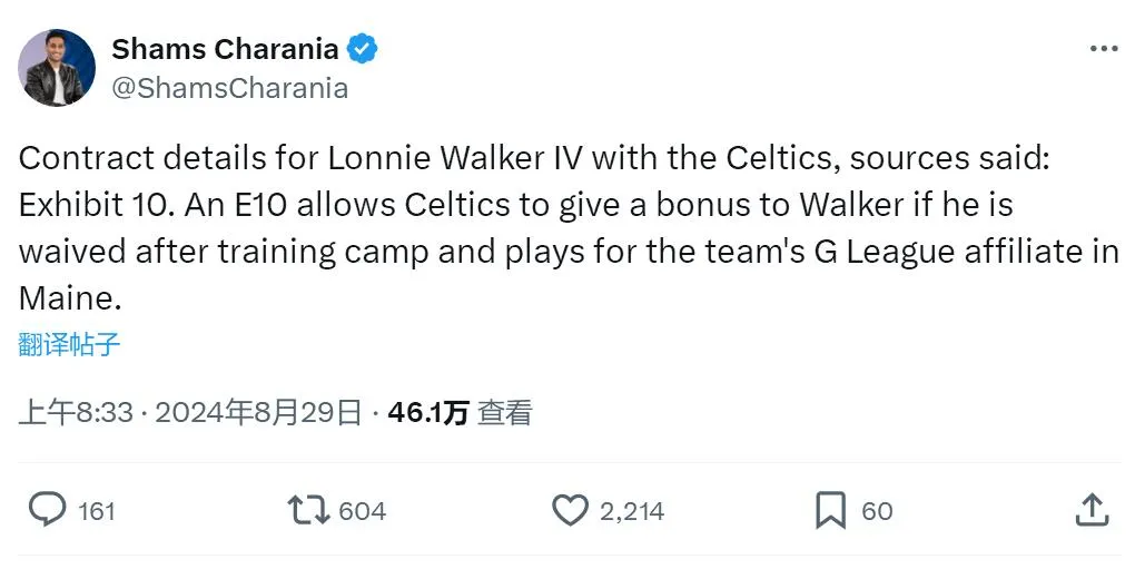 科普一下:Exhibit 10合同,为期一年,带有Exhibit 10条款。仅包含Exhibit 10本身奖金,没有其他奖金。如果该球员被NBA球队裁掉,他能够加盟该队在发展联盟的附属球队,留队满60天可拿5000-50000美元的奖金。