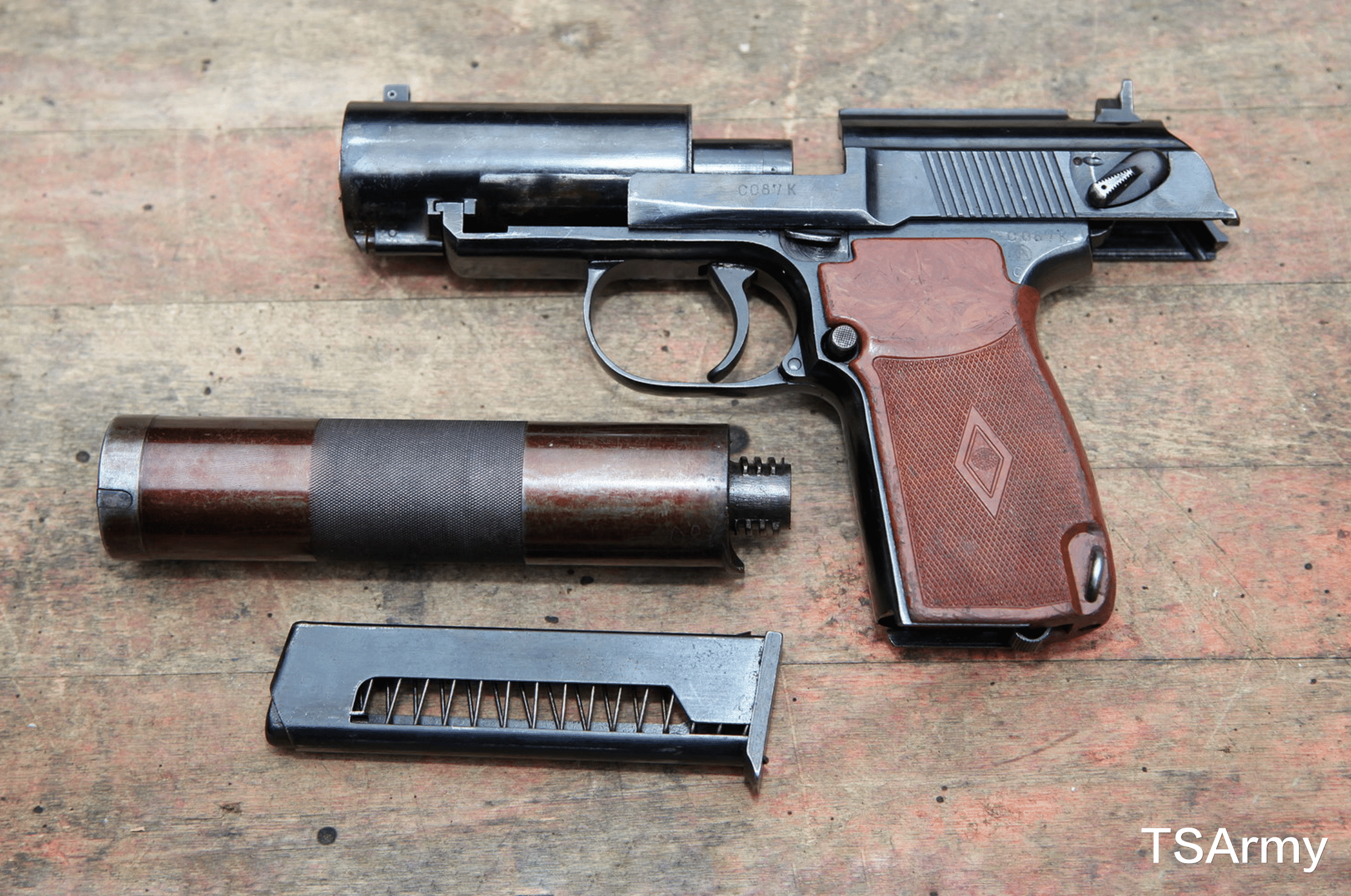 简称:PB手枪,这是前苏联在上世纪60年代,根据马卡洛夫半自动手枪的基础,改进出来的一种消音型号,最大特点就是为该枪配备了消音器,并且发射亚音速子弹,可以做到开火时无烟和微声。