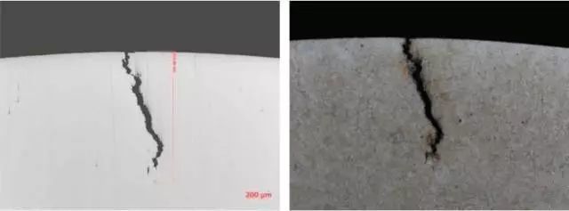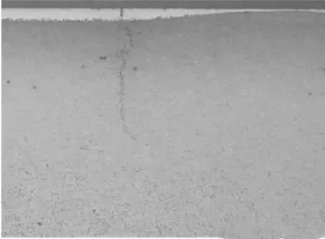 分析结论:存在脱碳的裂纹要分辨是否是原材料裂纹,一般裂纹脱碳深度大于等于表面脱碳深度的为原材料裂纹,裂纹脱碳深度小于表面脱碳深度的锻造裂纹。