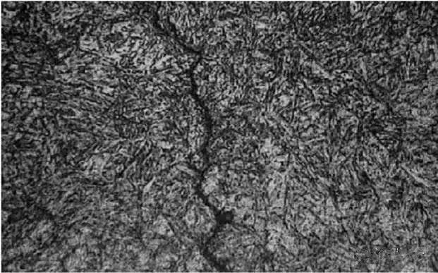品裂纹处未发现异常冶金夹杂,没有脱碳现象,裂纹呈锯齿状延伸,具有淬火裂纹的典型特征。