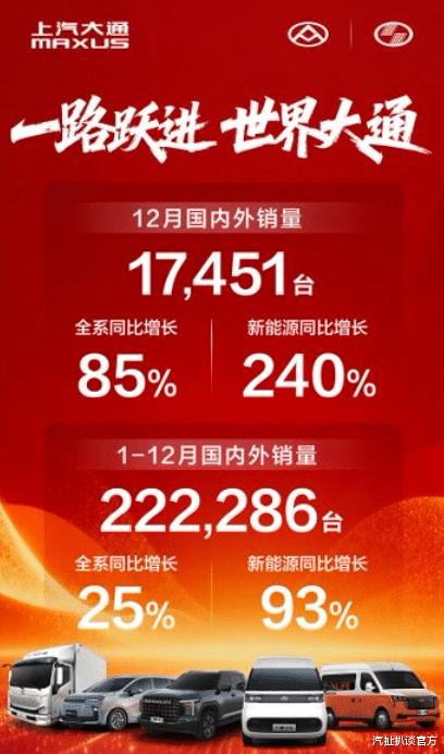 具体来看,上汽大通轻客板块全年热销9.3万辆,同比增长30%,持续巩固“中国轻客第一品牌”市场地位,出口量登顶行业第一;皮卡板块全年热销近5.7万台,稳健增长14%出口量稳居中国品牌第二,以高品质路线在全球皮卡高地“插旗立标”;上汽大通旗下跃进品牌轻卡全年热销4万辆,同比增长近128%,新能源车型交付超2.1万辆,引领轻卡行业绿色升级。