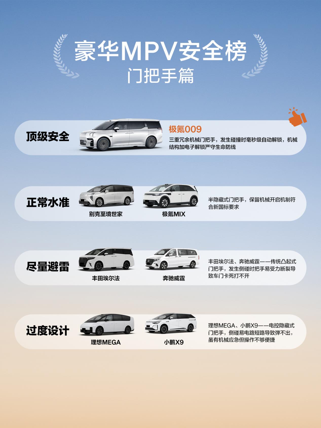 极氪009配备三重冗余机械门把手,碰撞时毫秒级自动解锁,机械结构 + 电子解锁双重守护,严守生命防线,安全感拉满!#极氪