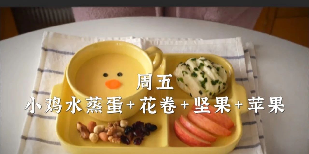 2、、鸡蛋蒸好后记得给它做个造型食欲满满,搭配坚果和苹果营养均衡。