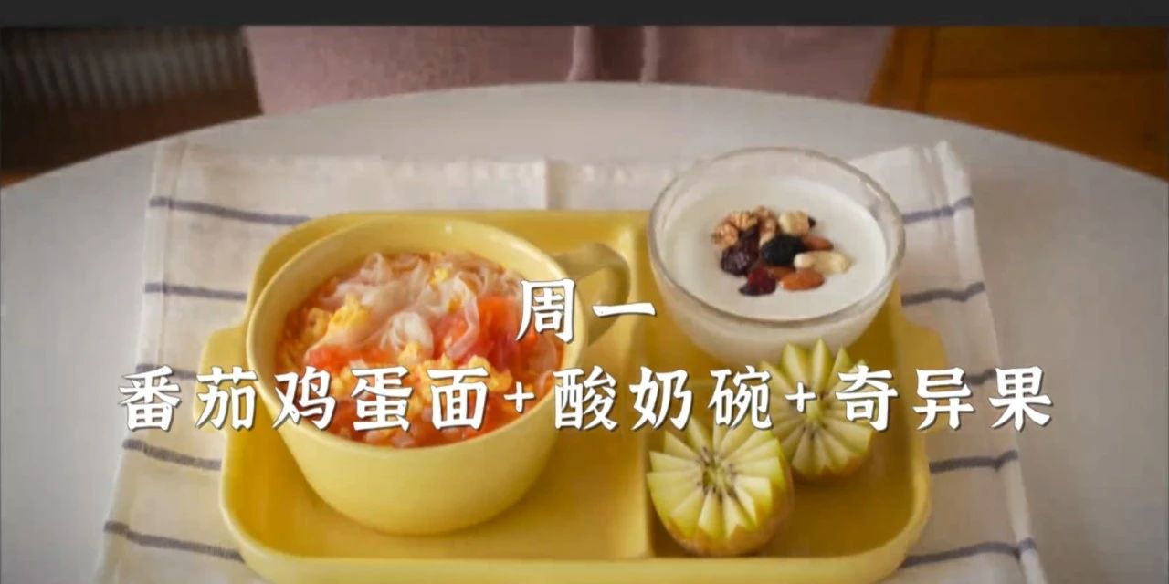 周一、番茄鸡蛋面+酸奶碗+奇异果