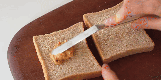 2、全麦吐司均匀地抹上花生酱,香蕉切成片摆在花生酱上。剩下的香蕉不要浪费,和牛油果牛奶一起放进搅拌机里打成奶昔,健康有营养,入口也不会有涩感。