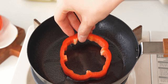 1、周末时间充足,花样可以做得多一些。锅中烧油,红红的彩椒清洗干净后给它拦腰切圈,下锅后中间的地方磕个蛋一起焖煎,煎好后的荷包蛋颜值又高又营养。