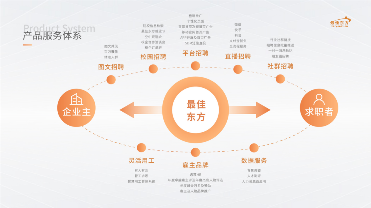 为更好地服务求职者,最佳东方旗下的招聘产品有:最佳东方PC端网站&APP&触屏端、最佳东方求职小程序、最佳东方抖音小程序、最佳东方支付宝小程序、最佳东方快手小程序、最佳东方百度小程序,打造出覆盖求职者日常使用全场景的服务矩阵。