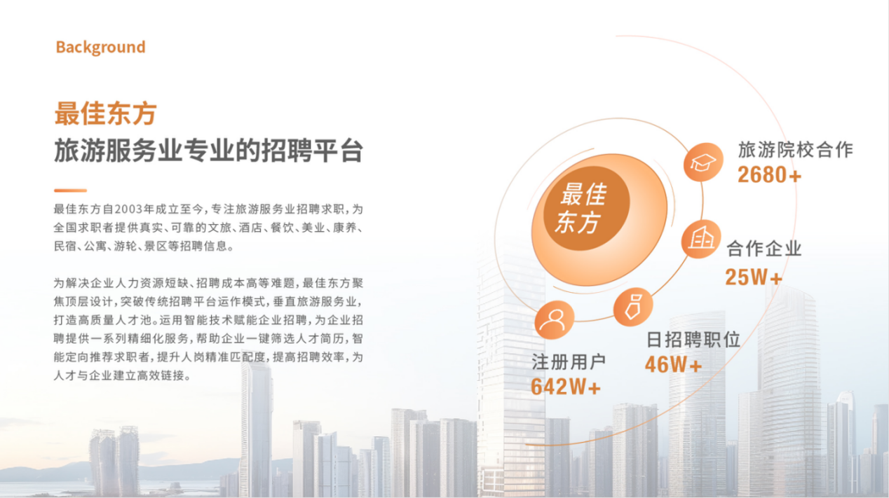 最佳东方是东方网升旗下第一个成立的品牌,作为垂直旅游服务业招聘的第一平台,目前已深度覆盖“吃住行游购娱康美”8大赛道,提供全场景的招聘解决方案,也是国际国内头部酒店集团指定的招聘服务商(如:万豪、洲际、锦江、首旅等),目前已占有90%的市场份额;(截至目前最佳东方酒店餐饮美业的个人求职者超642万, 日招聘职位超46万、合作企业超25万, 合作院校2680+)。