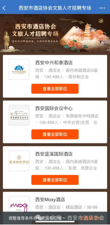 企业增效:求职者可通过"西安市酒店协会"微信公众号 —“人才招聘”板块实时查看岗位动态并投递简历,会员企业可充分利用互联网技术实现高效的人才对接,进一步提升企业招聘效率。