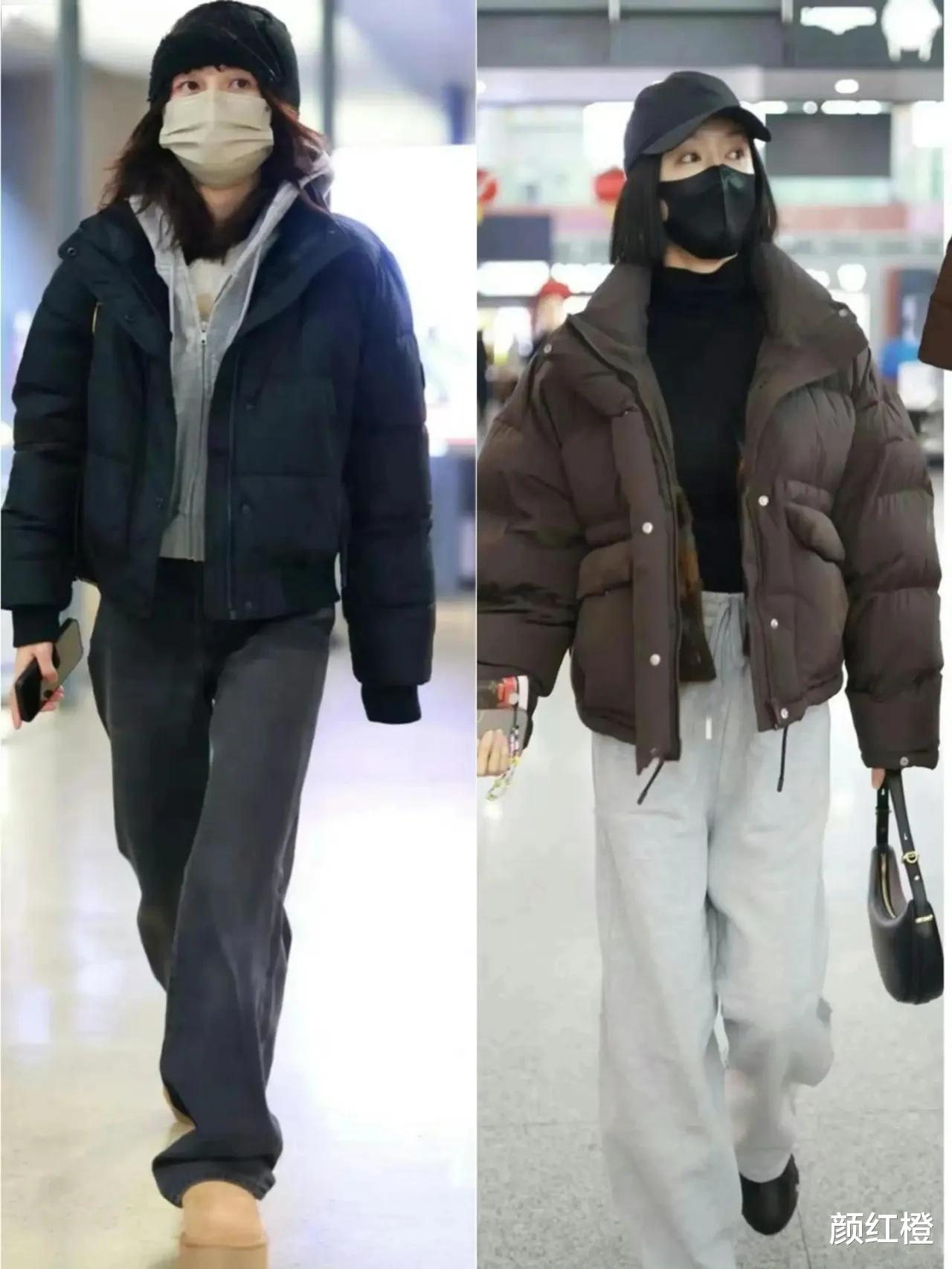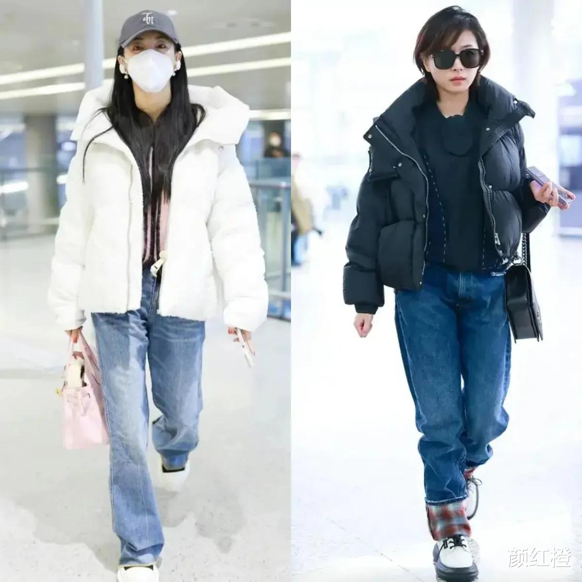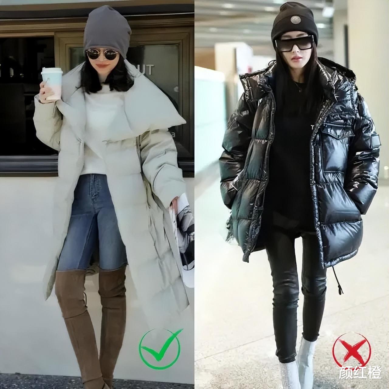 有的时候就算女明星也会穿搭错误,例如下面刘涛右边的这1套穿搭用比较蓬松感的黑色羽绒服,搭配上低腰的牛仔裤,脚上穿的白色的皮鞋,这样的搭配有点压身高,不是那么的利索。