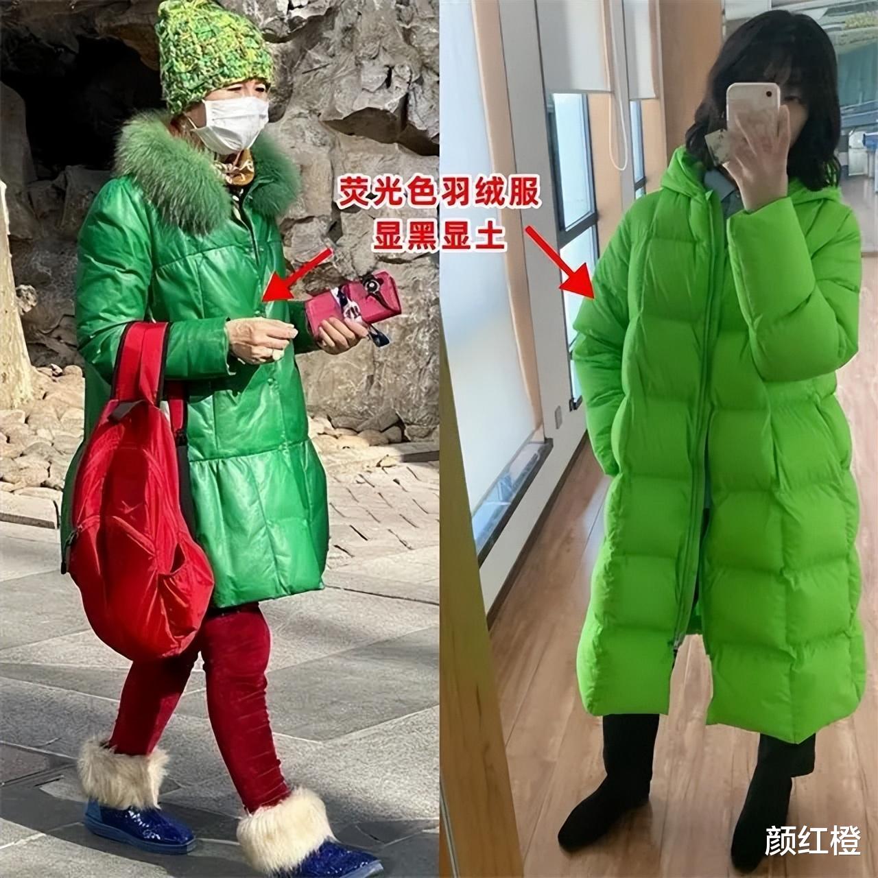 甚至是衣服颜色很亮,例如下面这种荧光色的羽绒服,当你选择这样的色彩来搭配,毫无疑问会使得你整个人显黑显老气。