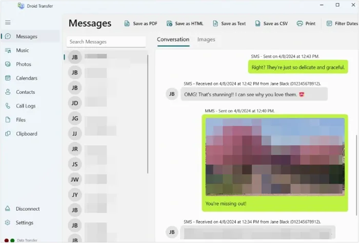 1.5 机器人传输Droid Transfer 是一款专用的 Windows 应用程序,可与 Android 上的“Transfer Companion”应用程序配合使用。它擅长将短信和彩信保存为 PDF 或文本文件,这是许多其他传输工具所不具备的独特功能。