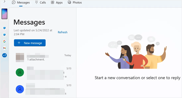 1.4 Microsoft Phone Link如果你想让手机和电脑像一个整体一样运作,PhoneLink 就是你的最佳选择。它不仅可以传输照片,还能让你在 Windows 桌面上查看通知、回复短信,甚至运行手机应用。大多数 Windows 10 和 11 电脑都预装了 PhoneLink。