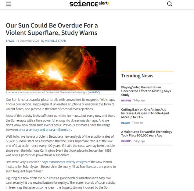 12月,《科学》杂志发布研究警告,太阳可能爆发100年一次的超级耀斑,这对人类来说并不是好事情。
