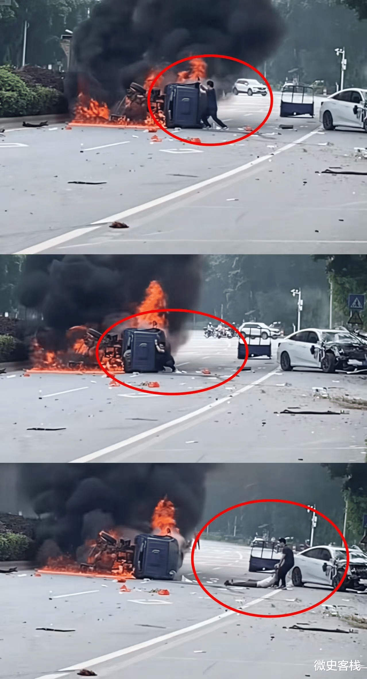 救人男子钟威讲述救人过程:钟威称自己路过时正好遇上这起交通事故,拨打了120,钟威称自己打电话时手都是抖的,这是正常人遇到交通事故的正常反应,打完电话后,钟威便尝试上去救人。钟威第一次尝试破窗救人时,被爆燃逼着退后了几步,短暂观察火势情况后,钟威再次上前,将驾驶员拖到路边。