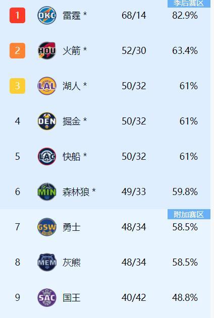 西部前十的排名依次为:雷霆、火箭、湖人、掘金、快船、森林狼、勇士、灰熊、国王、独行侠。
