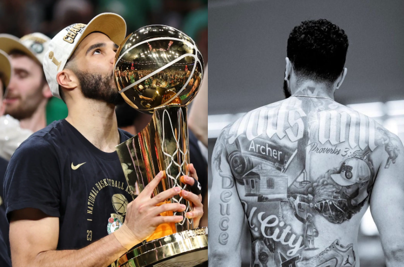 北京时间9月20日,凯尔特人球星杰森-塔图姆又添加了一处新纹身,把自己亲吻总冠军奖杯纹在后背上;今夏塔图姆还把自己捧着全明星赛MVP奖杯的画面纹在大腿上。