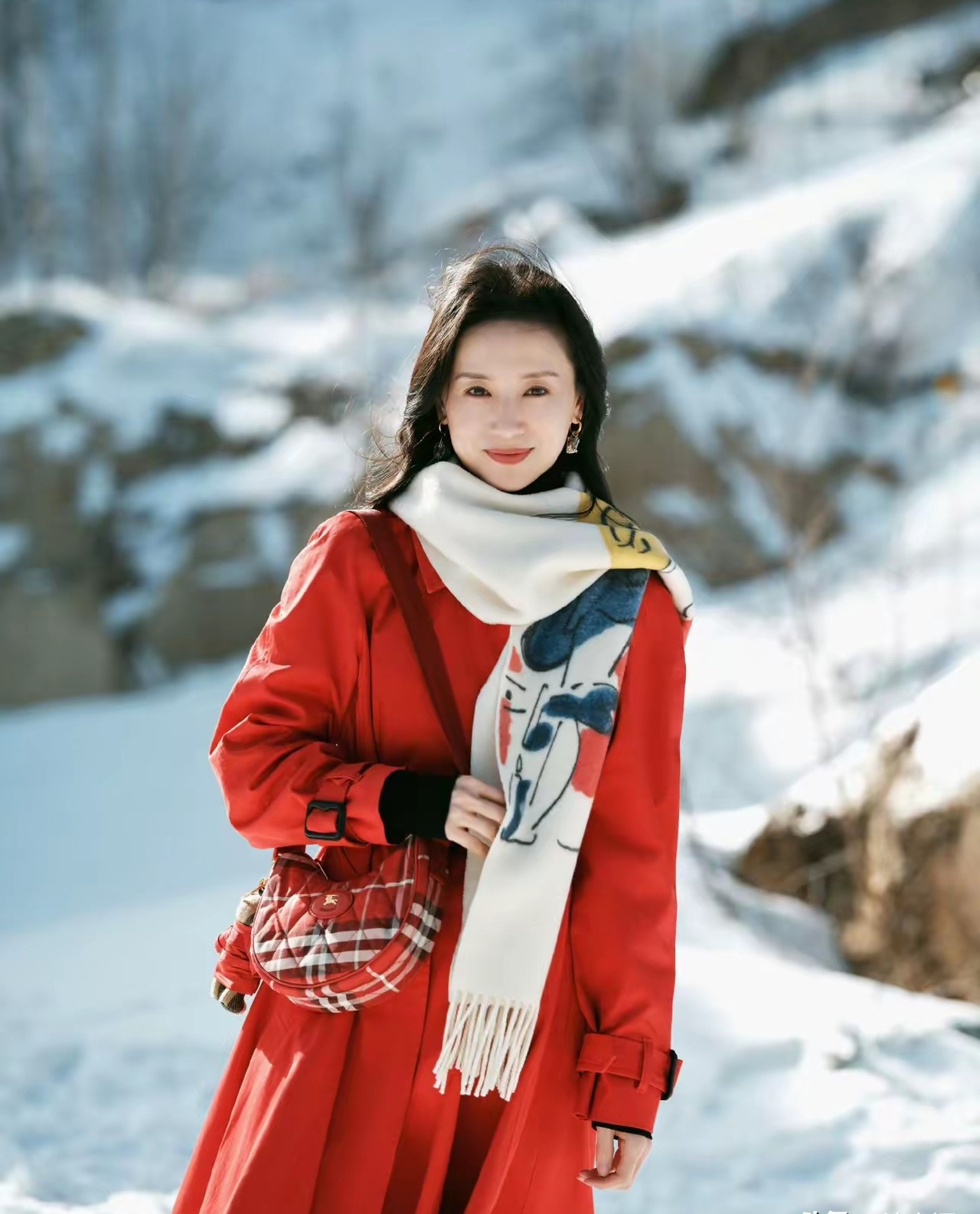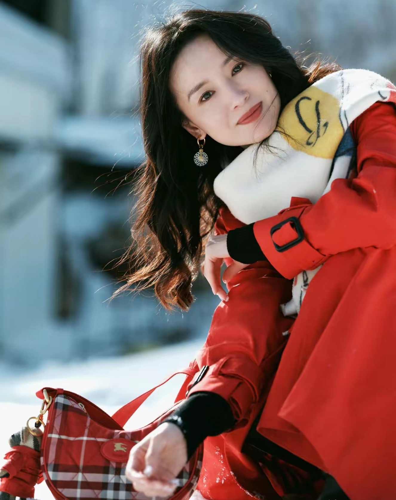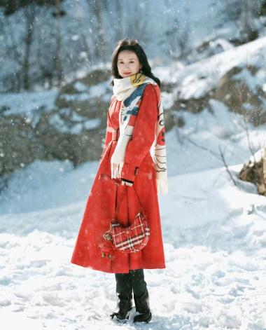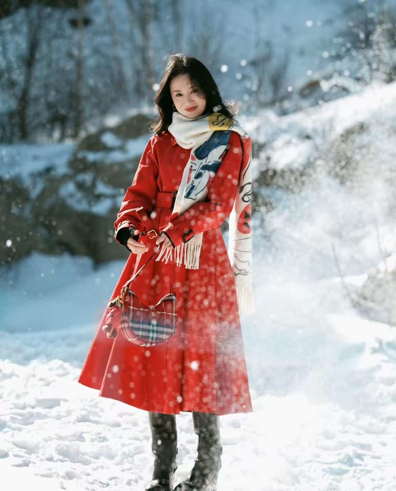 白色雪原与红色大衣形成了绝佳的视觉对比,如同雪中绽放的红梅,散发着东方女性特有的温婉与坚韧。董洁选择的这款正红色羊绒大衣,剪裁利落流畅,腰带设计巧妙勾勒出身材比例,在保暖的同时兼顾了造型感。她搭配的黑色长靴与皮质手套,恰如其分地平衡了红色的浓烈,让整体造型醒目而不浮夸。